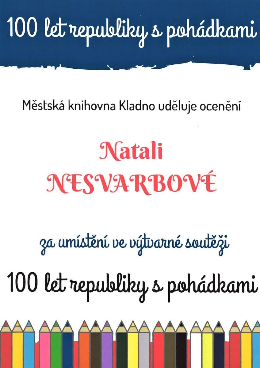 Městská knihovna Kladno mimo své hlavní poslání pořádá mnoho doprovodných akcí i soutěží. Vyhlásila i výtvarnou soutěž s názvem „100 let republiky s pohádkami“ u příležitosti 100. výročí vzniku Československa a 100 let od prvního vydání „Nůše pohádek“ Karla Čapka. Žáci naší školy se s chutí zhostili tematického úkolu namalovat svou nejoblíbenější českou nebo slovenskou pohádku a nejzdařilejší práce byly zaslány do soutěže. Knihovna do soutěže obdržela 182 soutěžních prací, ze kterých odborná porota ocenila 18 mladých výtvarníků. K naší velké radosti se mezi oceněnými umístili dva žáci naší školy – Natali Nesvarbová (3.A) a Michal Pelc (8.A). Oba se zúčastnili v prostorách Čítárny Městské knihovny Kladno slavnostního vyhodnocení soutěže a zaslouženě obdrželi diplom a pěknou knihu. Na výstavu všech soutěžních prací zamiřte do Městské knihovny Kladno, kde nainstalovány v prostorách Dětského oddělení.