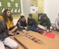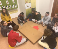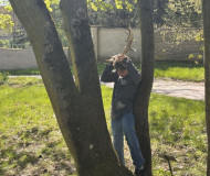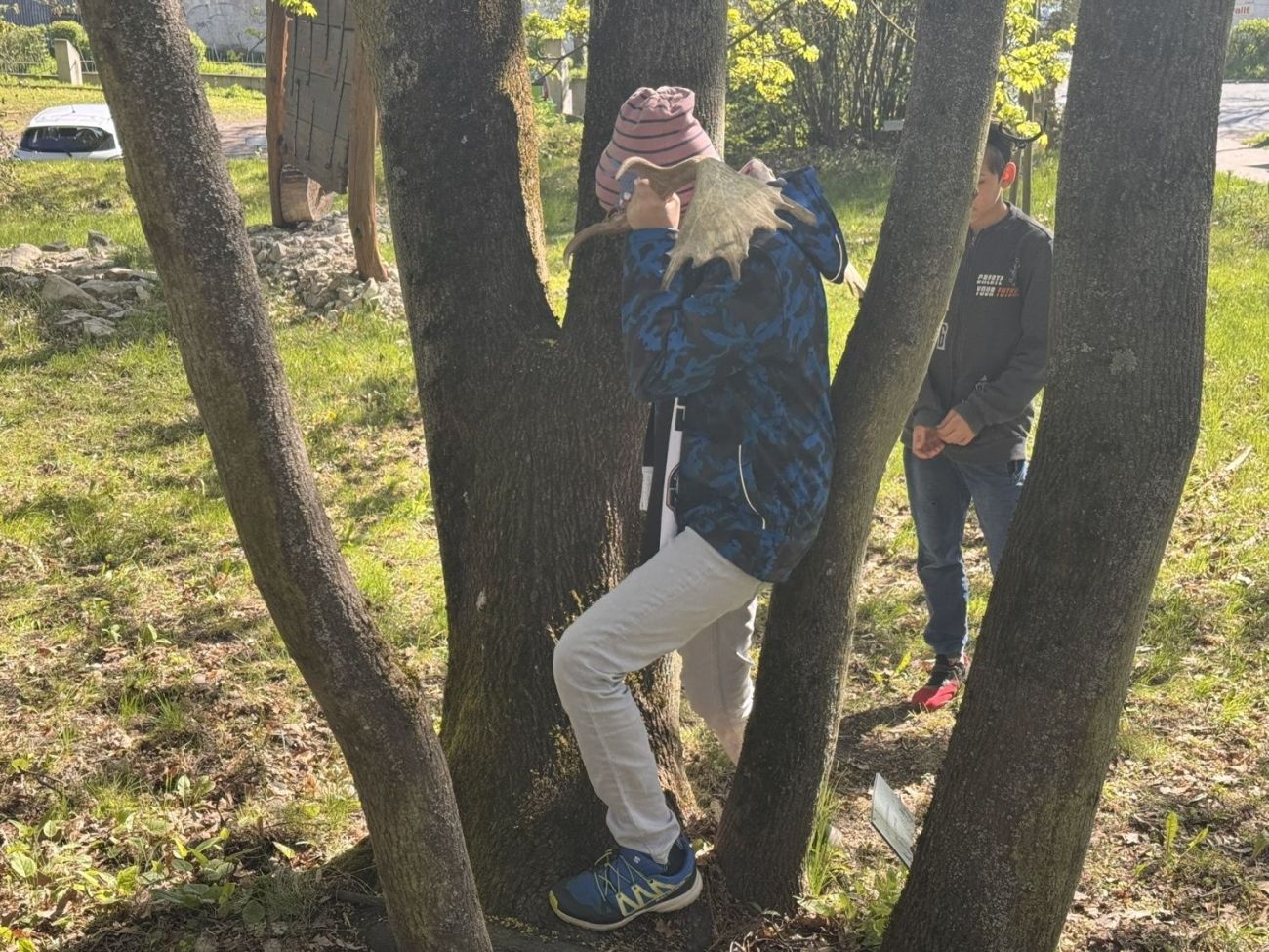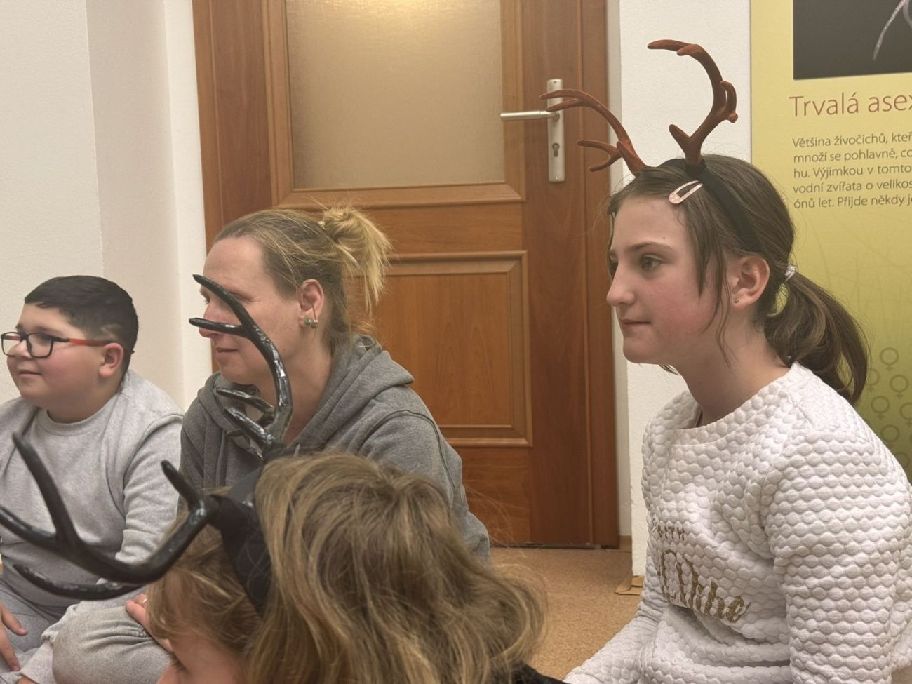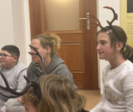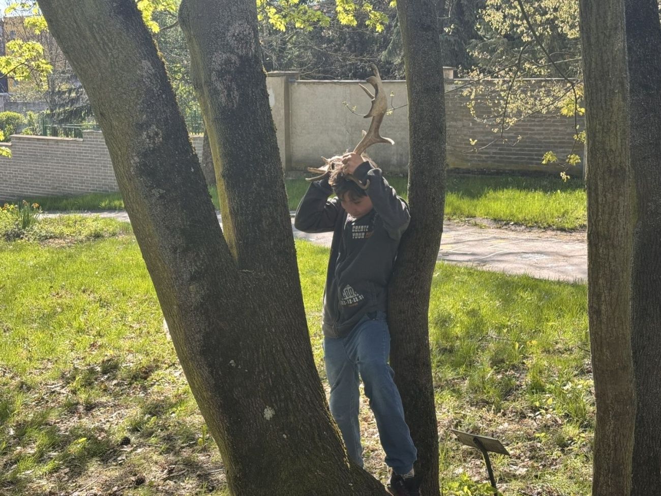 Dále program pokračoval na zahradě, kde jsme si zkusili na pár chvil být jelenem a pohybovat se s těžkými parohy.